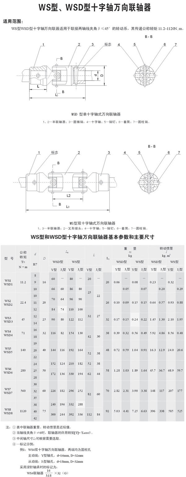 WS/WSD型十字軸式萬向聯(lián)軸器特點(diǎn):使用于聯(lián)結(jié)空間同一平面上兩軸線夾角β≤45°的傳動(dòng)場(chǎng)合?煞譃閱问中、雙十字型、可伸縮型和法蘭型。具有傳遞扭矩大,使用壽命長(zhǎng),應(yīng)用范圍廣等特點(diǎn)。它的應(yīng)用特別是對(duì)冶金行業(yè)的技術(shù)改造及機(jī)械產(chǎn)品更新?lián)Q代提供了在有利條件。中間采用方塊體加滑動(dòng)軸承可傳遞大扭矩,采用滾針軸承可提高轉(zhuǎn)速,理論達(dá)到4000轉(zhuǎn)/分鐘。特殊設(shè)計(jì)更可達(dá)到10000轉(zhuǎn)/分鐘。